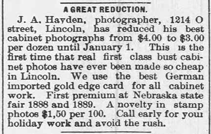 Lincoln, NE, city directory. J A Hayden as photographer at 1214 O st,