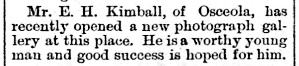 Mansfield (PA) Advertiser, item says E H Kimball has leased a gallery in Osceola for photography